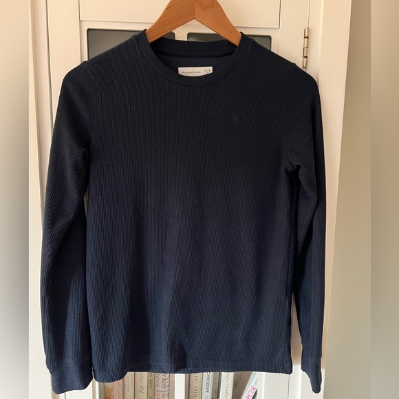 Navy sweater type top. The material is between a flannel and sweater. Worn 5 times if that? Has a navy moose. Smoke free, clean home. Size 13/14.