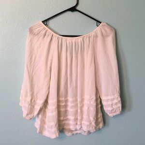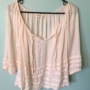 Cropped, loose 3/4 sleeve, beautiful light linen-like fabric.