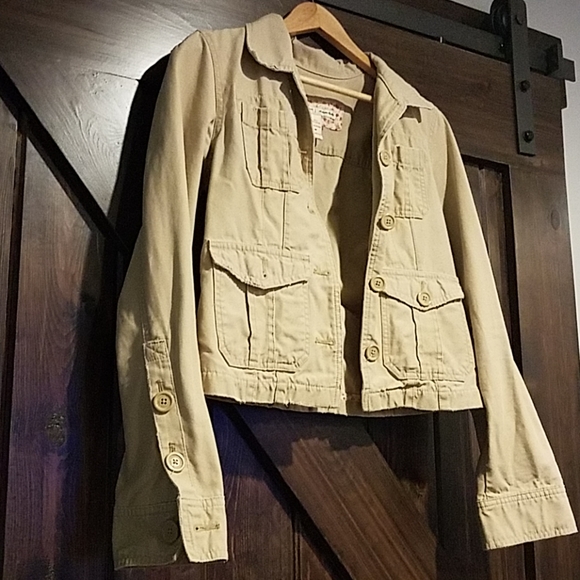 Casual cool tan jacket with floral detailing on inner seams. Distressed hems. Three button closure on cuff. Four front pockets. Tag says medium but fits more like a small.