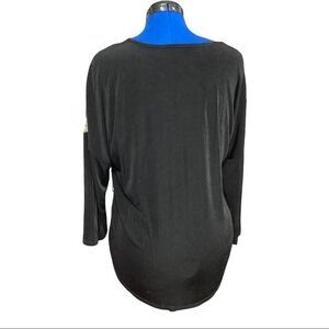 AFFINITY FOR KNITS, Women’s multicolored top, Sz L, Solid: 95%Acetate, 5% Spandex, Print: 100% polyester, Lining: 100% polyester. Machine wash, 3/4 length sleeves. Very stretchy. Although the tag says large, I believe this top may run big. Please see approximate measurements in pictures before purchasing. Use your own judgment as to the fit. Send me an offer. I will either accept or counter! Don’t forget to bundle and save.