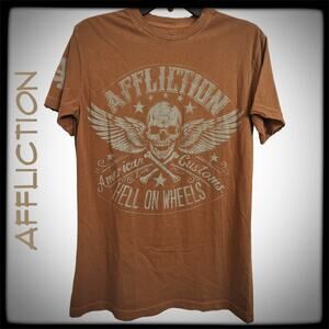 AFFLICTION American Customs Hell on Wheels Winged Skull T-Shirt Orange Men's S