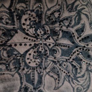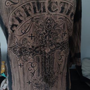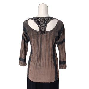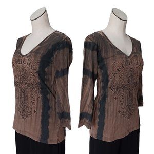AFFLICTION • Small beaded shirt v-neck tie dye cross lace crochet accent women's