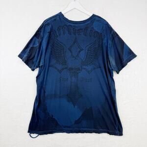 AFFLICTION Thrashed Distressed Graphic Tee Skull Cross Angel Wings Blue Mens 2XL