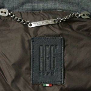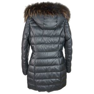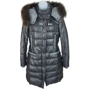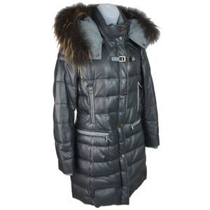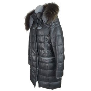 AFG 1972 Black Quilted Leather Fur Hooded Down Puffer Coat Size 36