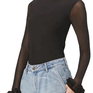 Mesh sleeves and rosy cuffs start the style story for this alluring top, but it's the barely there back that really draws the applause. Jewel neck Open cowl back Long sleeves Lined, except sleeves 95% polyester, 5% spandex Machine wash, tumble dry Imported