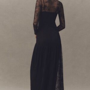 This high neck, long sleeve, maxi dress delivers sexy romance in our delicate lace fabrication. Featuring a drop waist with gathering at the bottom for fullness, she demands attention from all.