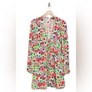A vibrant floral print pops on this long-sleeve minidress fashioned with a plunging neckling and drawstring-tie waist.