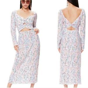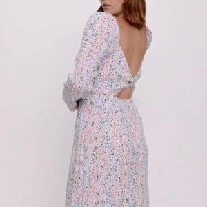 AFRM dress in size medium. Perfect condition, never worn (though does not have tags). Hidden side zipper with cut out details. Splatter color dots and twist-framed cutouts in front and back, mid-length. Can be styled to be sassy or demure.