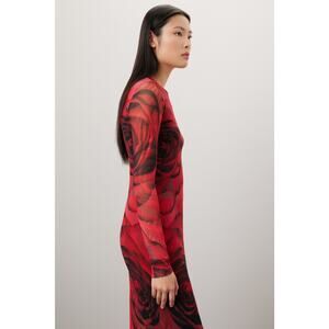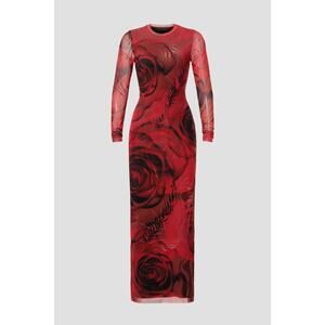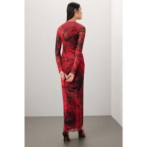 Red floral mesh (96% Polyester, 4% Spandex). Maxi. Long sleeves. Crewneck. Pull on. 51.5"" from shoulder to hemline. Imported.