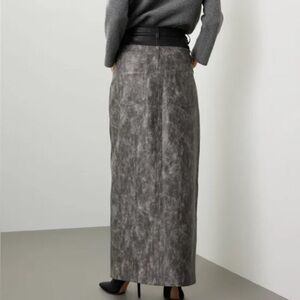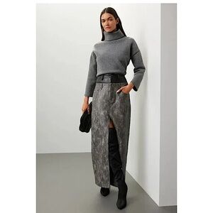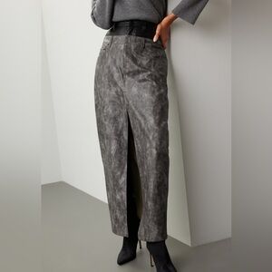 The Easton Double Maxi Skirt by AFRM stands out in style, a modern statement piece that blends elevated edge with effortless versatility. This stretchy high-waisted stunner flatters the waistline and elongates the silhouette—perfect for those with a taller frame and longer torso. Double-waisted faux leather maxi skirt by AFRM. With its sleek silhouette, high front slit, and edgy layered waistband detail, this skirt is perfect for taking your look from street style to office glam.