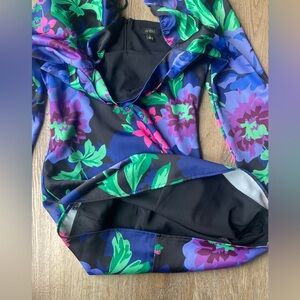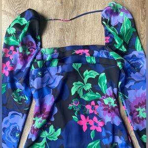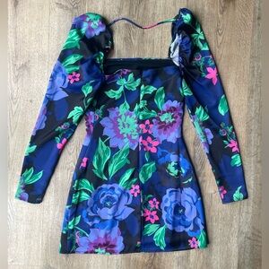 Elevate your style game with this edgy AFRM floral bodycon dress, featuring a vibrant print of bold blue, green, and purple florals on a sleek black base. The square neckline, puffed long sleeves, and fitted mini silhouette nudge you straight into statement territory. Fully lined for comfort and sexy shape.