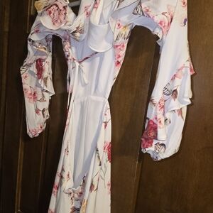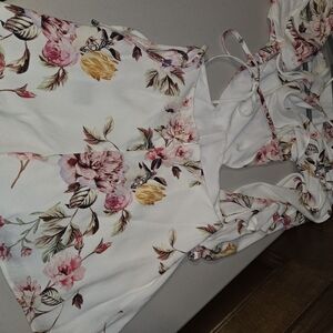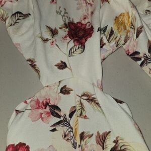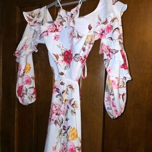 Elegant off-shoulder romper with floral print. Features ruffled sleeves and a fitted waist. Perfect for special occasions. There is a tie in back and this is backless down to the shorts. cutest romper for Spring/Summer. Booty enhancer fabric.