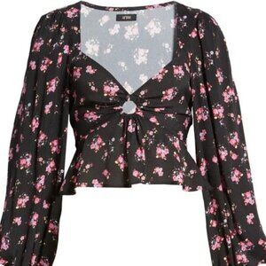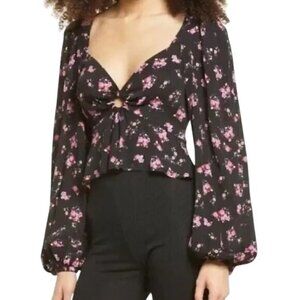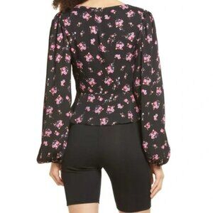 AFRM Hart Black Floral Keyhole Peplum Balloon Sleeve Blouse