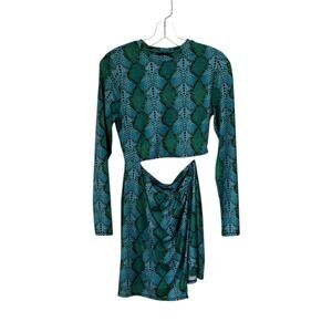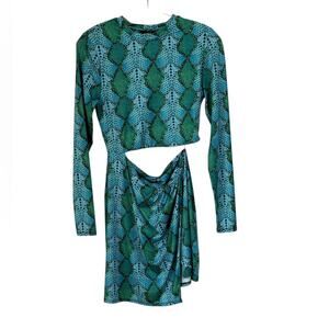 AFRM: Iman Snakeskin Print Cutout Long Sleeve Minidress in Teal Snake – Med