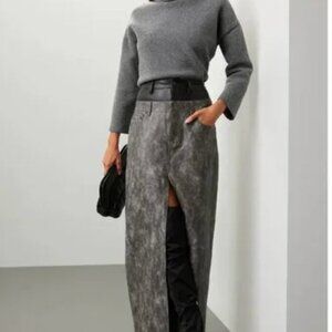 The Easton Double Maxi Skirt by AFRM stands out in style, a modern statement piece that blends elevated edge with effortless versatility. This high-waisted stunner flatters the waistline and elongates the silhouette—perfect for those with a taller frame and longer torso. Double-waisted faux leather maxi skirt by AFRM. With its sleek silhouette, high front slit, and edgy layered waistband detail, this skirt is perfect for taking your look from street style to office glam.