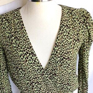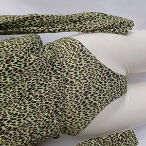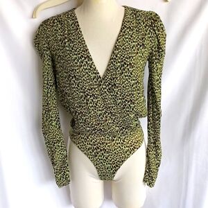 AFRM Neon Green Black Leopard Animal Print Puff Sleeve Bodysuit, 18" PTP, Sz XS