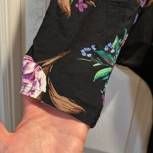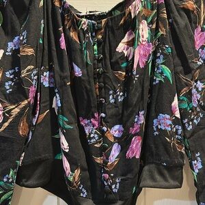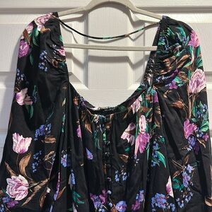 Gently worn AFRM Noir Bouquet Black Purple Floral Square Neck Bodysuit women's size large. 100% rayon, black with purple floral print, square neckline with elastic trim, long sleeves with puff shoulder, faux buttons up front, snaps in crotch, thong style bodysuit. Offers accepted!