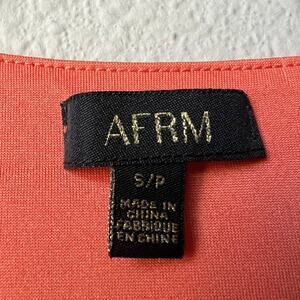 AFRM orange and purple zebra stripe fitted mesh crop top. Front double button and loop closure. V-neckline. Long sleeves. Sheer sleeves, lined bodice. Light stretch poly spandex fabrication. In great condition. Size small - 16.5" pit to pit; 16" total length.