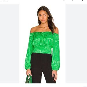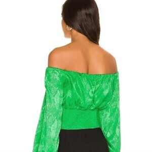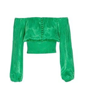 Sexy and romantic, the Jonas top has statement blouson sleeves and an off-the-shoulder silhouette. In a snake jacquard satin, she features a wide waistband, front button detail, and back smocking.