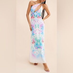 Step out in style with this AFRM sheath dress, perfect for a night out or cocktail event. Featuring a striking one-shoulder neckline, sleeveless design and deep V-neck cut/out, this maxi dress combines elegance with a modern touch.