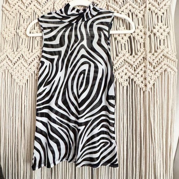 New with tags AFRM sleeveless mesh tank in a bold black and white zebra print. Features a sheer, body-hugging fit with mock turtleneck neckline. Lightweight stretch mesh perfect for layering or wearing on its own for an edgy, fashion-forward look.