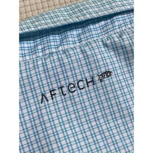 AFTCO short sleeve button-up shirt in light blue plaid with embroidered back branding. Made from lightweight, breathable 100% polyester for performance comfort. Tagged size Large. Pre-owned, clean condition. Ideal for fishing, outdoor wear, or casual summer style.