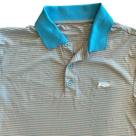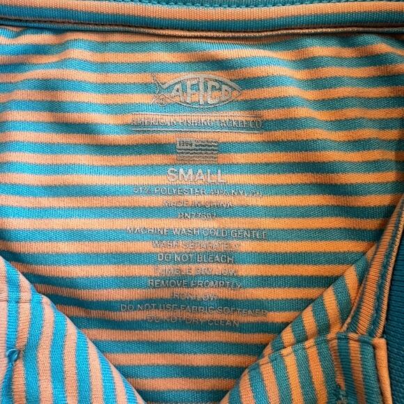 AFTCO Men’s Small Tech Polo Shirt Blue Orange Stripe Performance Fishing