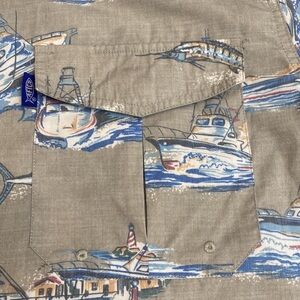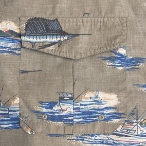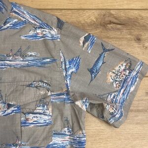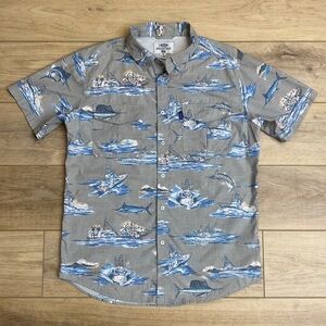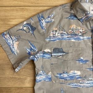Lightweight short sleeve grey Hawaiian print shirt by American Fishing and Tackle Company, AFTCO. Features to front flap pockets and a mesh vented yoke. The neutral tropical pattern features blue and cream boats and swordfish. Button down shirt collar. Some marks on the lower front left, as pictured, largely disguised by the print, otherwise great condition, Mens Size Medium M