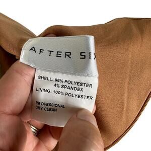 Stretch charmeuse draped midi dress from After Six in size 0R. New with tags in toffee color. Mannequin is a 6, so the dress does not fit the form, but does fully zip.