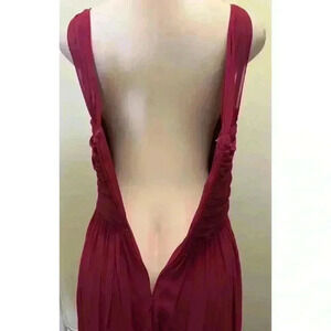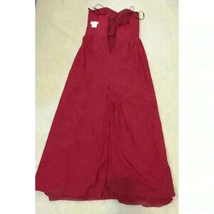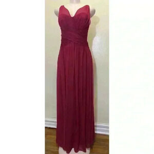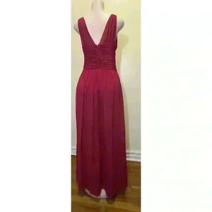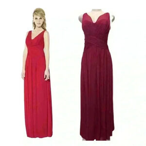 The full length sleeveless V-neckline luxury chiffon bridesmaid dress features a crisscross draped midriff and ruching at the front and back skirt.