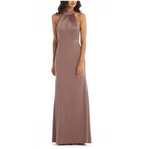 A glossy shirred bodice gives way to a soft crepe skirt in this classic gown styled in a deeply flattering halter-neck silhouette with an alluring open back.