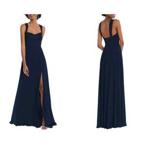 Make a statement at your next event with this stunning After Six midnight navy blue evening gown. The dress features a sweetheart neckline and sleeveless design with a zip closure. The chiffon fabric type gives it an elegant flow and is perfect for a wedding or formal occasion.