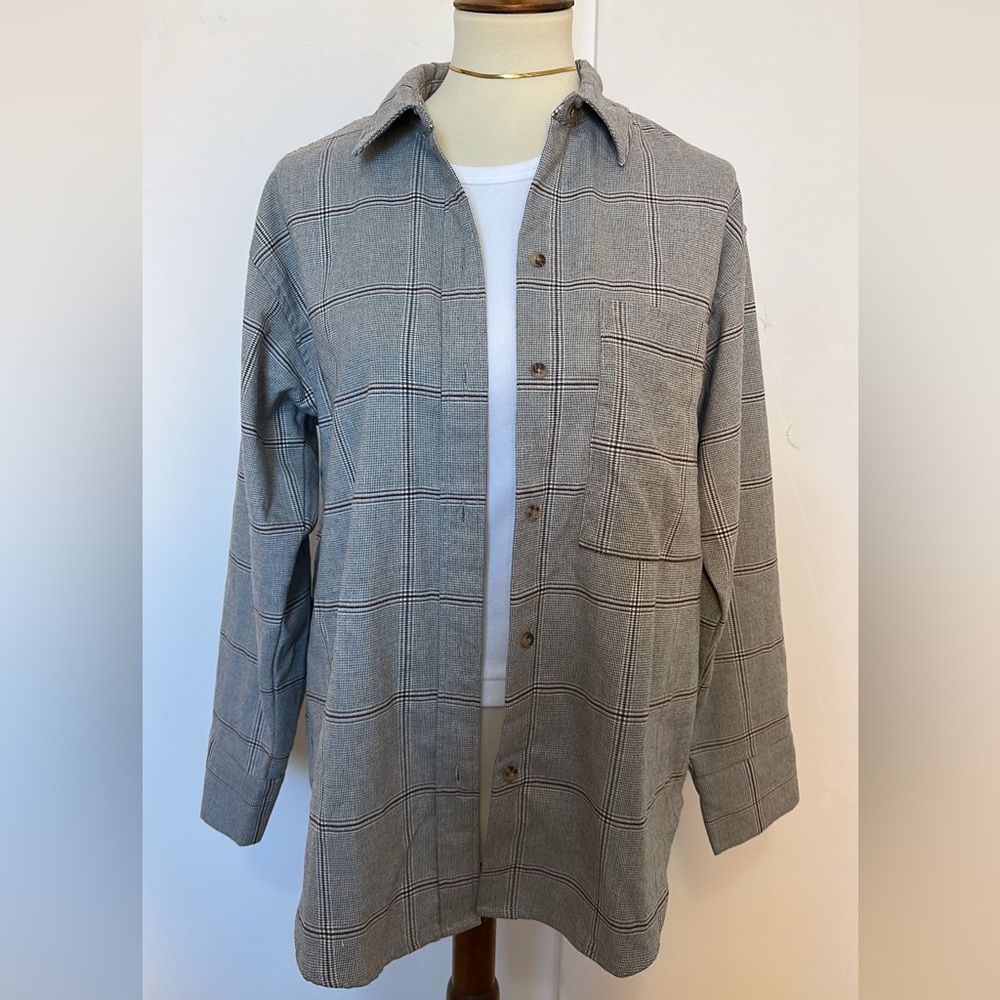 Casual gray checkered shirt jacket, features button-up front and chest pocket. Includes a skirt.