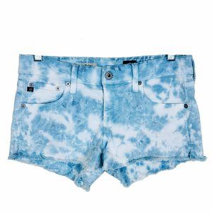 Tie Dye Low Rise Women's The Daisy denim jeans Shorts by AG Adriano Goldschmied. Cute blue and white cutoffs. Raw fringe hem edge. Great Boho vibe! Made in USA.