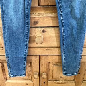 Description: Stylish pair of skinny jeans with a button and zipper closure. Features pockets at the front and back. Zipper detail at the bottom of the leg adds a unique touch.