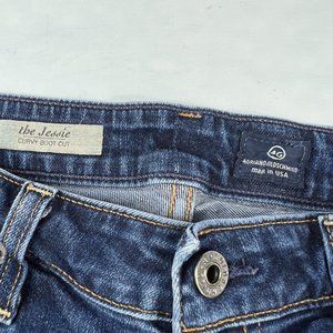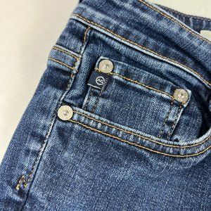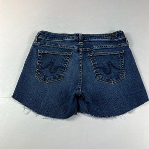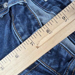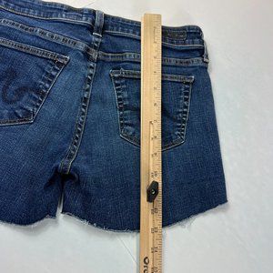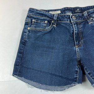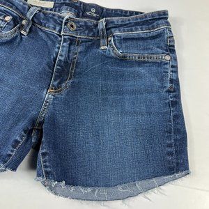 Stylish dark blue jean shorts. Frayed hem. Classic five-pocket design. Button and zip closure.