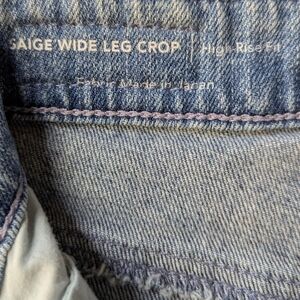 Excellent preowned condition Saige Wide Leg Crop Jeans in High-Rise Fit from AG Adriano Goldschmied. Denim fabric made in Japan. Zipper fly and button closure. Light medium wash with whiskering and factory distressing. Raw hem. Classic 5 pocket design. Japanese denim. Copper rivets. Stretchy. 98% cotton 2% spandex/elastane. AG-ed Denim. No flaws or signs of wear, these look and feel brand new!