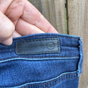 AG Adriano Goldschmied medium wash cigarette leg jeans. Two tone medium indigo blue wash, light front hip whiskering, white contrast stitching. Cigarette leg, similar to a slim-straight or skinny fit with a little extra room in hems that can be wore with cuffs rolled, mid rise, full ankle length leg.