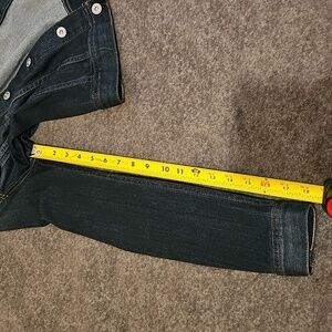 Classic dark blue denim jacket with silver buttons and gold stitching. Perfect anytime of the year. Size Small