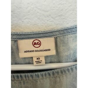 Keywords: AG Adriano Goldschmied, Denim Top, Fringe Sleeve Shirt, Womens Shirt, Casual Top, Bohemian Style, Light Wash Denim, Short Sleeve Top, XS, Designer Shirt, Fringe Detail, AG Jeans Shirt, Cotton Top