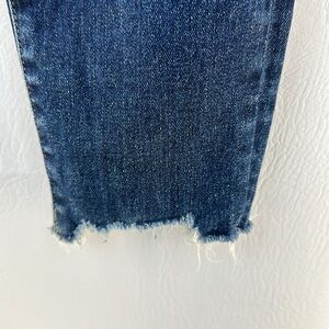 Raw hem edge, dark stitching on back pockets