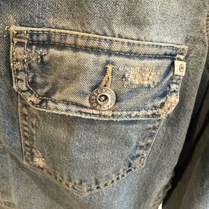 Stylish gray jean jacket. Features buttoned front and chest pockets. Perfect for casual wear.