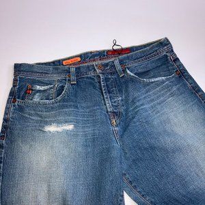 AG Adriano Goldschmied ICON Jeans Button Fly Sz 34X29 Distressed, red stitching