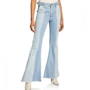 Features a 70's homage two-tone panel in contrast light denim washes, a flattering high-rise waist with adjustable D-ring cinches, raw fraying at the wide leg opening, and back-tacked ankle slits. This women's flare jean is designed in a thick, 100% cotton denim fabrication for a true vintage feel