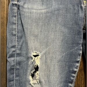 AG Adriano Goldschmied brand jeans. Distressed style. Cuffed hem. Cropped length. Mid-rise. Medium wash. Listed as Anthropologie when I purchased but I can not confirm that is 100% accurate because I bought them preowned. Stretch material. Preloved. Please see all photos for condition. Normal wear but still full of life.