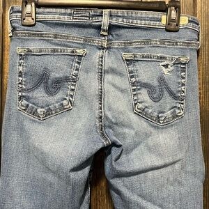 AG Adriano Goldschmied brand jeans. Distressed style. Cuffed hem. Cropped length. Mid-rise. Medium wash. Listed as Anthropologie when I purchased but I can not confirm that is 100% accurate because I bought them preowned. Stretch material. Preloved. Please see all photos for condition. Normal wear but still full of life.