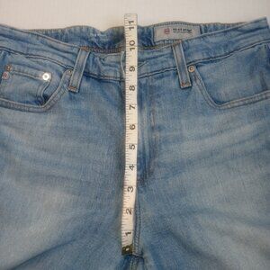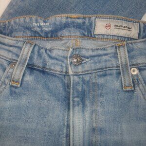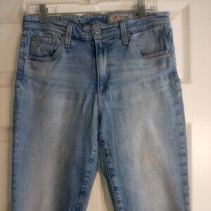 Stylish high rise jeans. Light blue wash. Frayed hem for a trendy look.