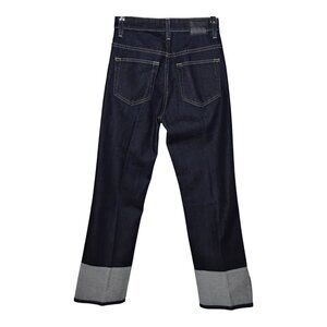 These Adriano Goldschmied The Rhett jeans feature a flattering high waisted fit with a modern / retro straight leg silhouette. Crafted in a rich dark indigo wash, the cropped straight leg design ends in a unique contrast cuff — the bottom 5.5" is sewn inside out for a stylish, designer twist. Classic 5 pocket styling and premium AG denim make these jeans versatile and upscale. The cuffs can also be rolled up for a sleek, all dark wash cropped look if you prefer. New without tags. Never worn and in excellent new condition.