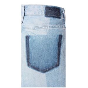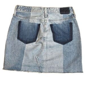 AG Adriano Goldschmied Jeans Denim Skirt. Size 27. Worn 1-2 times. Good condition. The skirt is a light blue, high-waisted denim mini skirt. It has a raw, frayed hemline that gives it a distressed, casual look. The front features standard denim elements, including a zipper fly and belt loops, while the back has dark denim patch pockets in contrast to the lighter denim fabric, adding a color-blocked, stylish touch. The overall style is chic and trendy, making it suitable for casual outfits, especially for warmer weather.