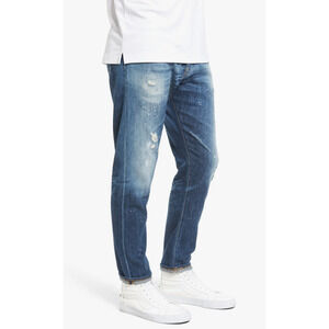 Crafted from Japanese denim, these jeans have undergone ample distressing with slashes and paint splatters for an authentic vintage-worn appearance that's seen plenty of action. The slouchy fit in the seat and thighs offers generous comfort while tapering to a narrower leg opening that's awesome for cuffing.